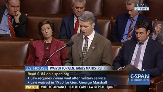 Rep. Wittman spoke on the House floor to urge his colleagues to support the "one-time only exception" for General Mattis. His remarks can be seen by clicking the image below.